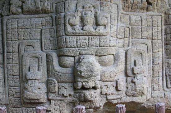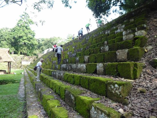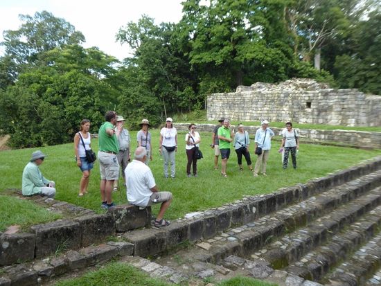 Doch dann geht es hinaus auf den grossen Platz mit den Stelen. Es sind die höchsten Stelen des Mayareiches und René erklärt uns die Symbole, die Schriftzeichen, die Herrscher, die den Platz geformt und getaltet haben. Quirigua war zuerst ein Untertan von Copan, wo wir gestern waren. Bei einem Besuch von 18 Kaninchen dem Copan-Herrscher wurde dieser enthauptet. Davon erzählt eine der Stelen. Ab diesem Zeitpunkt war Copan unabhängig und entwickelte sich selber zu einem grossen Staat.