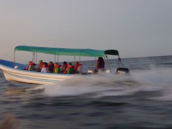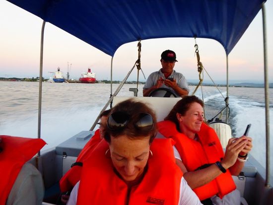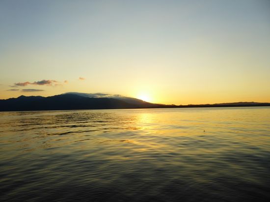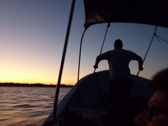 Hier erwarten uns zwei Boote. Inzwischen ist es Abend geworden. Ob René das genau so geplant hat, weiss ich nicht, aber der Zeitpunkt ist absolut ideal. Wir fahren in den Sonnenuntergang, der zwar weit hinten im Westen stattfindet, uns aber hier über dem Wasser eine wunderbar verzauberte Stimmung beschert.