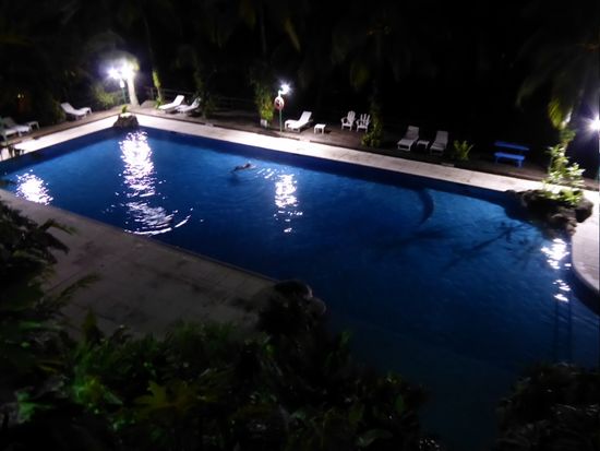 Die Farben am Himmel sind verblasst, die Dunkelheit hat übernommen, als wir später beim Hotel ankommen. Direkt am Meer mit Aussicht auf die Bucht und vor allem einem kühlen Pool, in dem man mich kurz nach der Ankunft findet.
