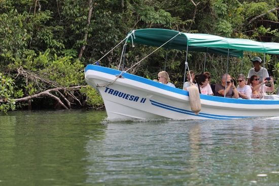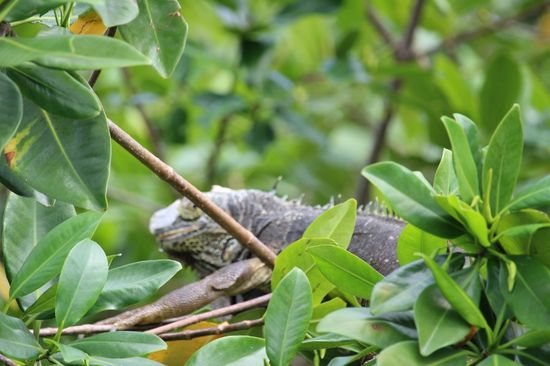 Doch bevor wir losfahren, will uns Eduardo, unser Bootsführer noch etwas zeigen. Gut versteckt in einem Gebüsch sitzen zwei Leguane. Sorgfältig manöveriert er das Boot in die Nähe, so dass alle einen Blick auf das reglose Tier werfen können. Ich bin immer wieder überrascht, wie die Einheimischen einen Blick für die Natur haben und Tiere anhand einer Unregelmässigkeit in den Ästen oder einer ungewöhnlichen Bewegung der Blätter erkennen.