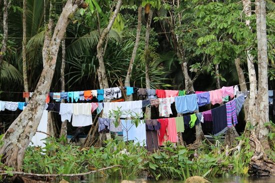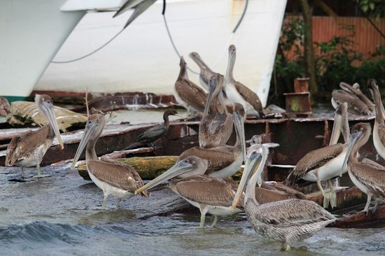 Wir tuckern los. Der Fluss schlängelt sich hier in grossen Kurven durch den grünen Dschungel. Auf beiden Ufern überbordendes Grün in allen Schattierungen. Hohe Bäume, zum Teil völlig überwachsen mit Schlingpflanzen, Bromelien hängen an den Stämmen. In den Àsten sitzen da und dort Silberreiher, Pelikane oder andere grosse Vögel.