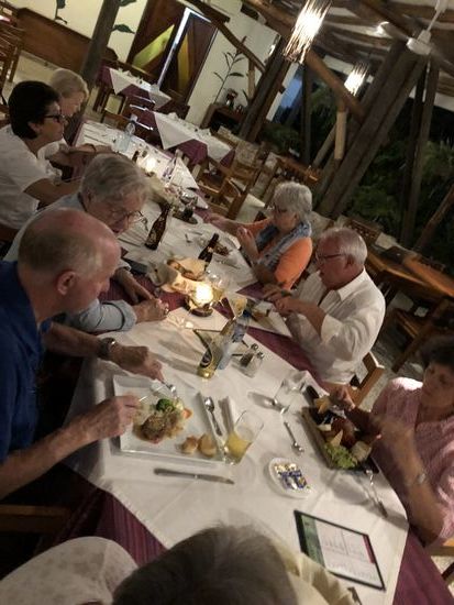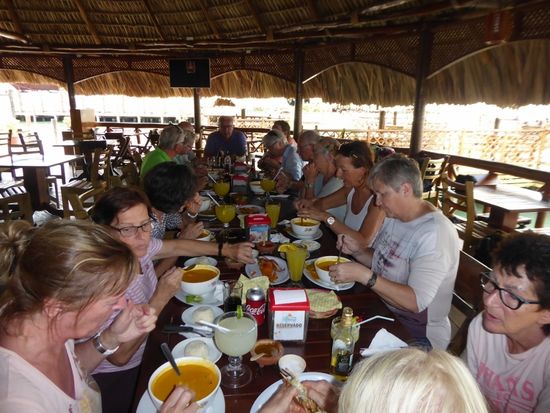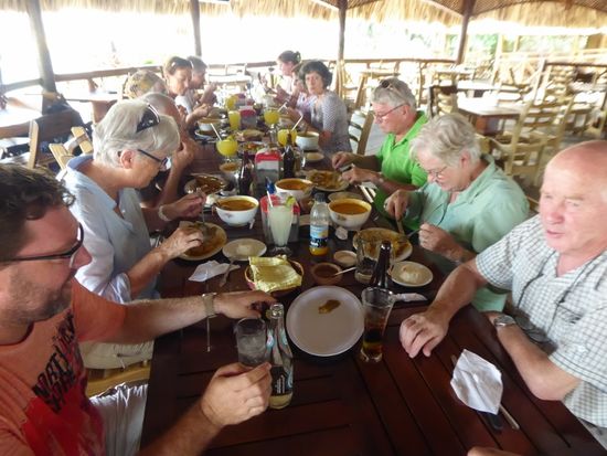 Für uns ist in einem Restaurant unten am Fluss der Tisch gedeckt. René hat für die, die Fisch uns Meeresfrüchte mögen, eine Tapado Garifuno bestellt. Die Spezialität wird mit viel Kokosmilch, Garnelen, Bananen, einem Fisch und einem Krebs gemacht. Vor allem der Krebs macht den Meisten etwas Mühe, denn es ist kaum etwas essbares daran zu finden. Die Suppe schmeckt fein, die Portionen sind allerdings viel zu gross.