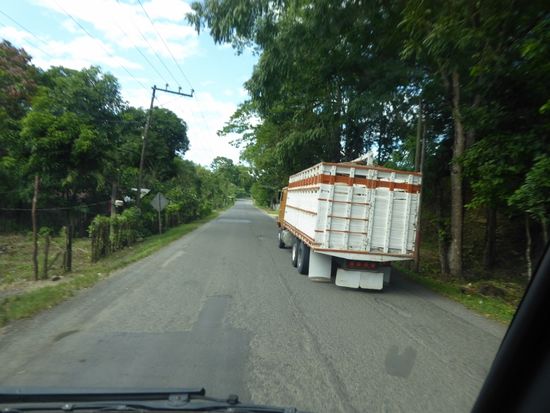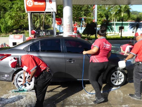 Dann steigen wir in den Bus, der uns hier erwartet und fahren in den Norden, hinunter ins Tiefland Guatemalas. Zuerst fahren wir noch durch bewohntes Gebiet mit grossen Kuhherden, dann übernimmt immer mehr der Dschungel das Szepter. An einer Tankstelle in der Hälfte der Fahrt machen wir eine kurze Rast. Es scheint hier, dass zum Tanken auch gleich eine Vollwäsche dazu gehört. Jedenfalls werden die Wagen von einer ganzen Equipe von Angestellten mit Bürsten, Tüchern, viel Schaum und Wasser auf Hochglanz gebracht.