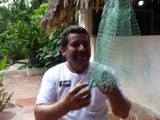 Vor der Küche sitzt unser Bootsführer und bastelt ein neues Fischernetz. Mit einem ganz feinen Nylonfaden knüpft er es, es sieht aus wie Klöppeln. Bis vor zehn Jahren sei er Fischer gewesen. Im Süden von Guatemala hat er auf dem Meer sein Einkommen gefunden. Doch dann kam der Tropenstum Stan und hat ihm alles was er hatte, genommen. Zufällig hat er den Besitzer der Boote in Sayaxche kennen gelernt, der ihn als Bootsführer in den Peten engagierte. Seither fährt er mit dem Longboat auf dem Rio Petexbantun.