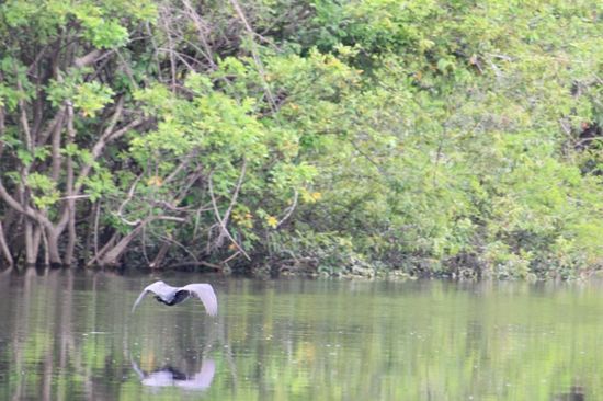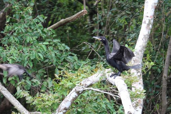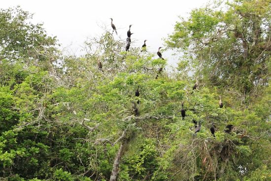 Kormorane, die in den obersten Ästen sitzen, kontrollieren unsere Fahrt und begleiten uns aus ihrem Revier. Weit hinten ertönen manchmal noch ein paar Brüllaffen. Die wenigen Menschen, die uns am Ufer begegnen, winken uns fröhlich zu. Silber- und Graureiher gleiten vor uns mit elegantem Flügelschlag über das Wasser.