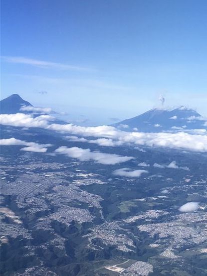 Wir fahren durch ein zerklüftetes Land mit tiefen Einschnitten. Guatemala wurde geformt von Erdbeben und Vulkanausbrüchen. Vom Flugzeug aus konnte man die Vulkankette gut erkennen. Der Fuego hat uns zu Ehren sogar eine kurze Staubwolke ausgespuckt.