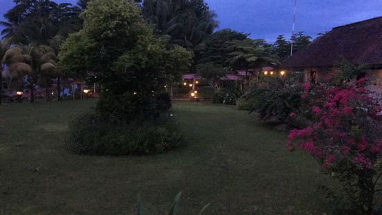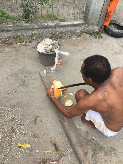 Der Chef des Hauses fragt uns, ob wir Kokosnuss möchten—möchten wir—und fix klettert einer die Palme hoch