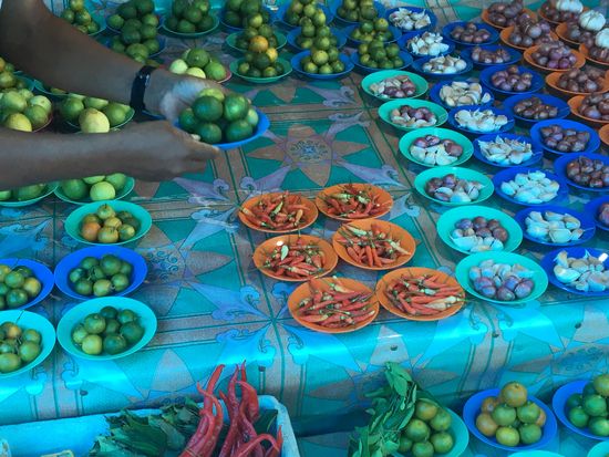 Wir kaufen ein paar kleine Mangos und Tomaten.