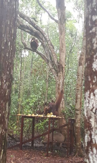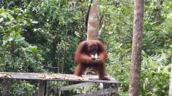 Oben im Baum sitzt ein Gibbon, der guckt sich das Ganze erst an und als er sich sicher wähnt, turnt er runter und holt sich schnell wasvom Essen