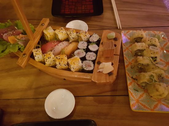 Bestellt haben wir zuerst zwei Bier - welches auch die letzen beiden Flaschen dieser Sorte waren. Dann gabs zur Vorspeise eine Sushiplatte für eine Prson für uns beide mit einer extra Rolle Hot Sushi... kreativ!!! Qualitativ und geschmacklich wirklich gut. Die Rollen an sich eher klein, aber da im Restaurant von Ho tendenziell grosse Rollen serviert werden, fällt das mehr ins Auge als es wirklich ist. Die Sushigrösse ist ans japanische Original angelehnt.