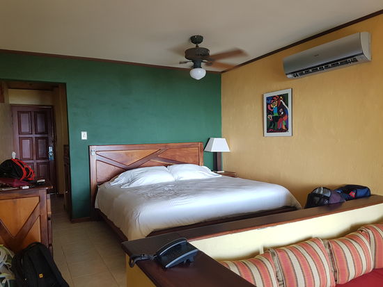 Zimmer: nicht die modernsten ihrer Sorte, aber wirkilich toll einreichtet, mit erhöhtem Bett mit Aussicht auf das Meer.
