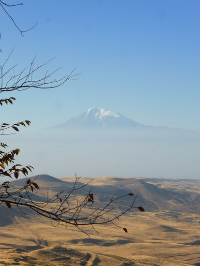 An einer Straßenbiegung bei Oghjaberd ist auf einmal der Ararat ohne Wolken am Gipfel zu sehen. Weit unterhalb ist allerdings der Dunst recht undurchdringlich.
