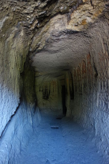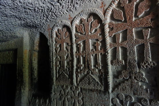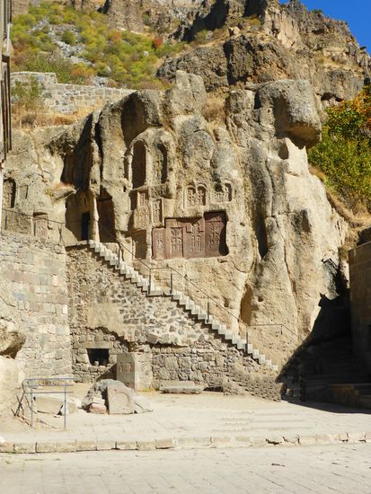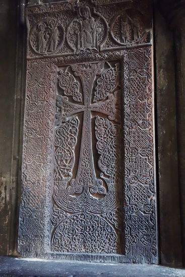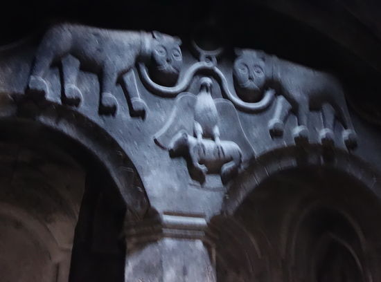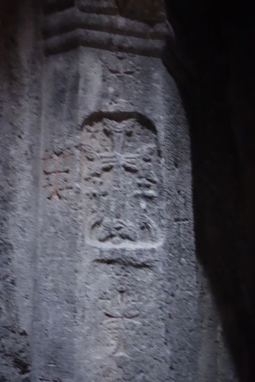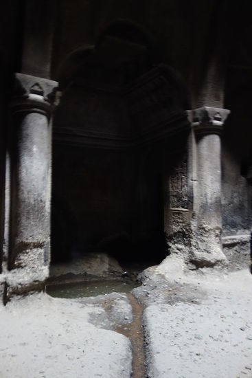 Die zweite Felskirche und ihr Gavith wurden 1283 gebaut und sind über die Nordostseite des großen Gavith zu begehen Auch diese beiden Felsgebaude sind etwas nach Norden gedreht Sie waren gänzlich als Grabstätten der Prosch|an bestimmt, deren Gräber sich in den steinernen Boden des Gavith eingelassen befinden. In der zweiten Höhlenkirche kann ich sogar einen kurzen Clip drehen, denn drei Gläubige stehen dort und singen Kirchenlieder.