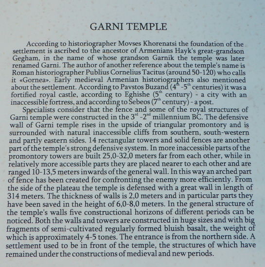 Historisch belegt ist die Annahme, dass es auf dieser Hochebene insgesamt fünf Bauperioden gegeben hat und die älteste davon auf eine heidnische Kultstätte aus dem 3. bis 2. Jahrhundert vor Christus zurückgeht. Die größten Bautätigkeiten entfalteten die armenischen Könige im 3. Jahrhundert, als sie eine Sommerresidenz nach römischem Vorbild gestalteten. Sogar in den Annalen des Tacitus wird diese Festung schon genannt, die die Römer auf ihrem Eroberungszug durch Armenien entdeckt hatten.