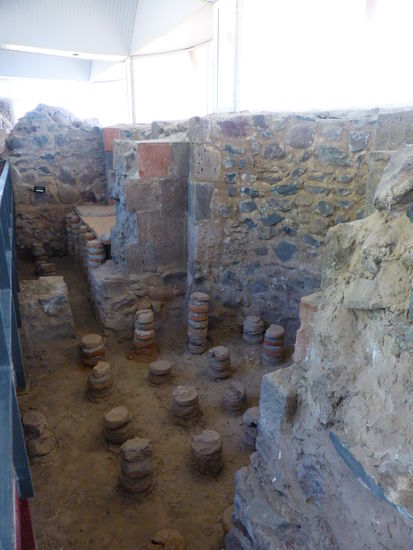 Die Ausgrabungen brachten als beachtlichste Reste der Palastanlage Teile des Badehauses zutage. Vermutlich im 3. Jh. entstanden sind 4 halbkreisförmige Räume zu sehen, die neben der Heizungsanlage auch ein kleines Musaik offenlegen.