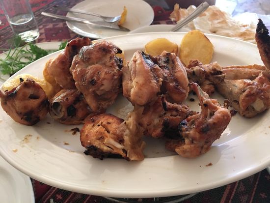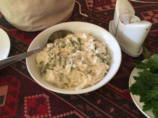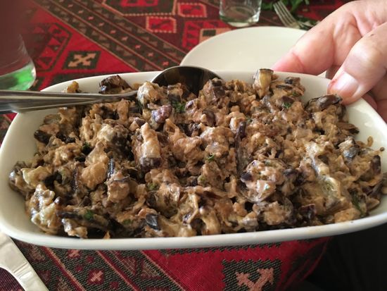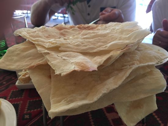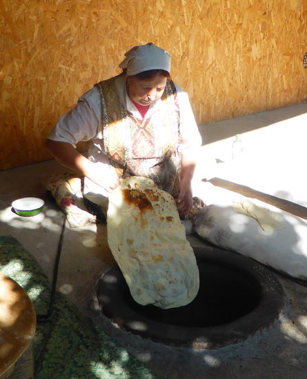 Nach der Kultur wird es dann wieder ‚touristisch‘ – vorbei an zahlreichen Souvenirkiosken geht es zu einer Bauernfamilie, bei der wir Mittagspause machen. , Zunächst wird das Lavash gebacken. Ähnlich dem Naanbrot in Persien, wird der Teig ausgerollt – allerdings hier viel dünner – und sodann auf eine Art Kissen gespannt, mit dem es in den in der Erde sitzenden Backofen an die Wand gedrückt wird. Nach der Vorführung gibt es natürlich sofort eine Probe, die man sich selbst mit Käse und Petersilie in das Lavasch einwickeln kann.