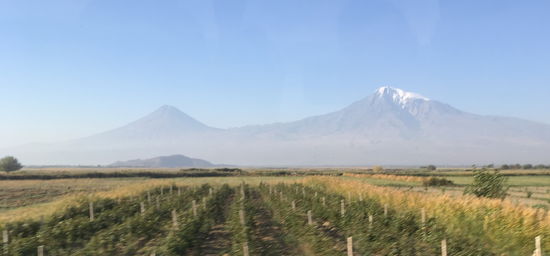Heute morgen ist Auszug aus dem Hotel und Abfahrt für 8.30 Uhr angesagt. Durch die Rushhour dauert die Fahrt aus der Stadt ca. 30 min.; heute führt unsere Tour nach Süden, zunächst durch ein Viertel mit zahlreichen verlassenen russischen Industriebauten. Die Provinz Ararat ist ländlich geprägt mit viel Landwirtschaft einschließlich Weinanbau, die Hauptstraße M2 Ist zwar breit aber recht holprig. Bei Power Vedi biegen wir dann rechts ab und fahren direkt auf den Berg Ararat zu.