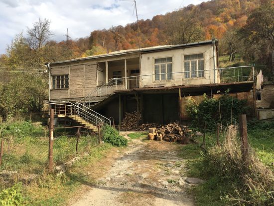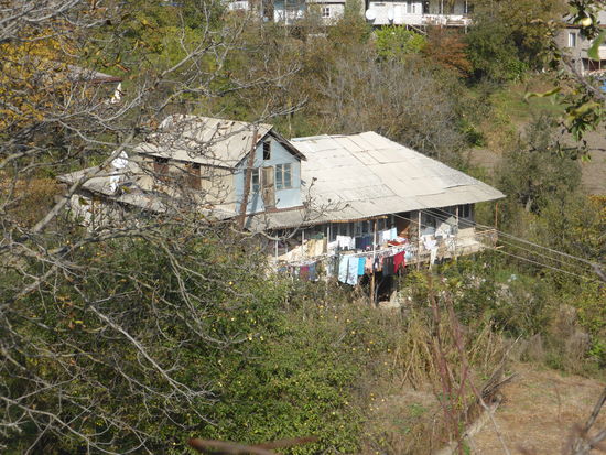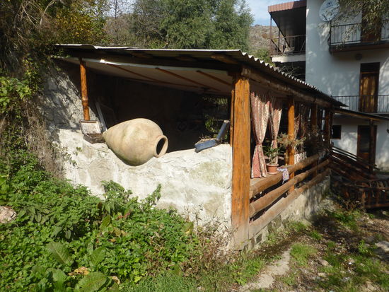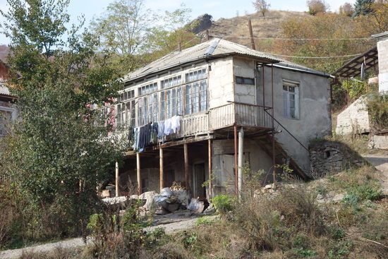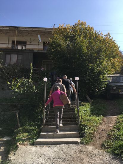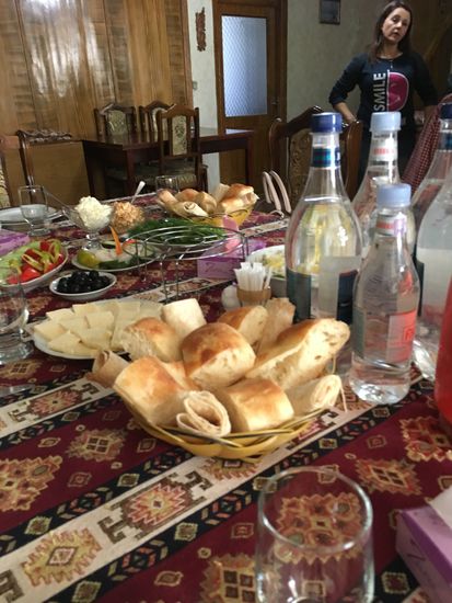 Nach Programm erhalten wir heute bei einer Familie ein Mittagsessen. Dazu fahren wir über die H30 wieder zurück auf die M4 bis zum Ort Dilijan. Dort ist wirklich nichts restaurant-ähnliches zu sehen und wir steigen tatsächlich Treppen hoch zu einem Privathaus, wo im Wohnzimmer der Tisch gedeckt ist. Die Einrichtung besteht einschließlich der Lampen aus den 50er Jahren; die Vorspeisen sind wieder reichlich und als Hauptgericht gibt es gefüllte Paprika, Tomaten und Kohlblätter.