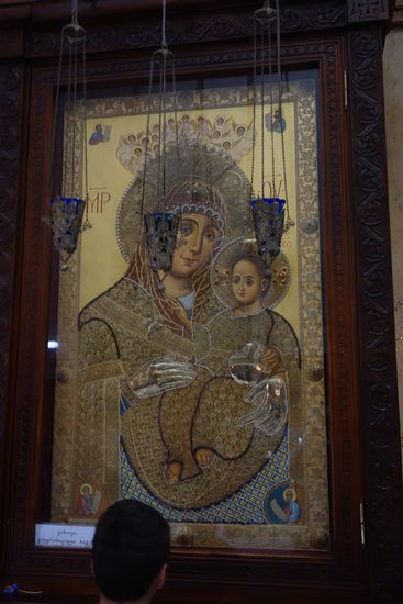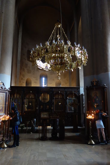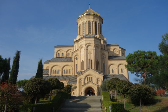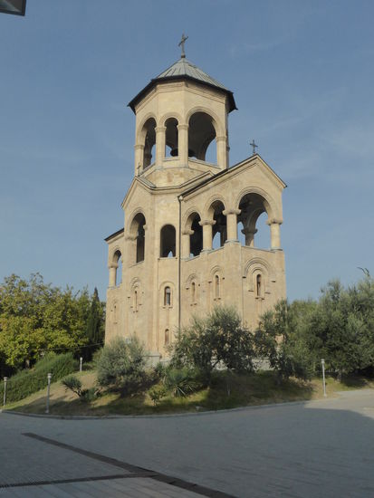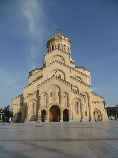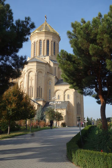 Auf dem Weg zum Palast sehen wir einen goldenen Kirchturm, er erscheint gar nicht so weit, also versuchen wir auch dorthin zu kommen. Nach mehreren Versuchen gelingt es uns den Zugang zur Dreifaltigkeitskirche (Zminda-Sameba-Kathedrale) zu finden.