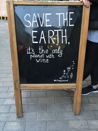 Kurz vor unserem Hotel gibt es eine ganze Restaurantstrasse, in der wir schließlich wegen der fortgeschrittenen Zeit einen Weinm gemäß dem außen präsentierten Spruch trinken.