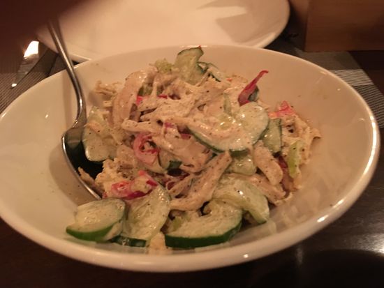 Das Abendessen im Kalasi-Hotel ist sehr ansprechend, für mich besonders angenehm, da man nicht an großen langen Tischen sitzt, sondern an Vierertischen, so dass eine Unterhaltung stattfinden kann. Das Essen ist stärker gewürzt als bisher, ansonsten sind die Vorspeisen ähnlich und der Hauptgang mit zwei verschiedenen Fleischsorten (Huhn in toller Sauce und Schwein mit Paprika) wird ‚dazu‘ geliefert – also kann man auch noch an die leckeren Salate.
