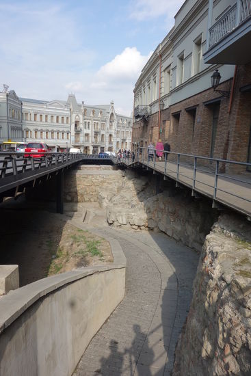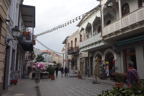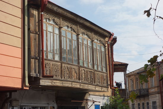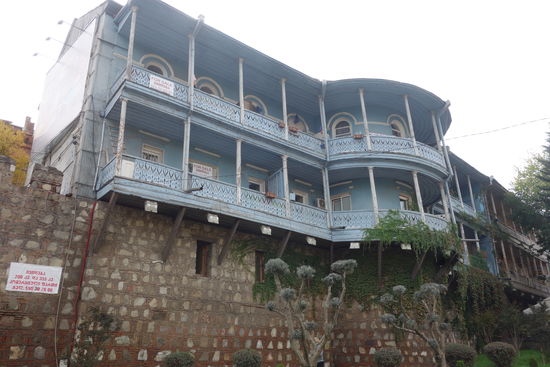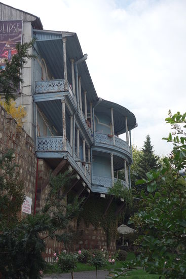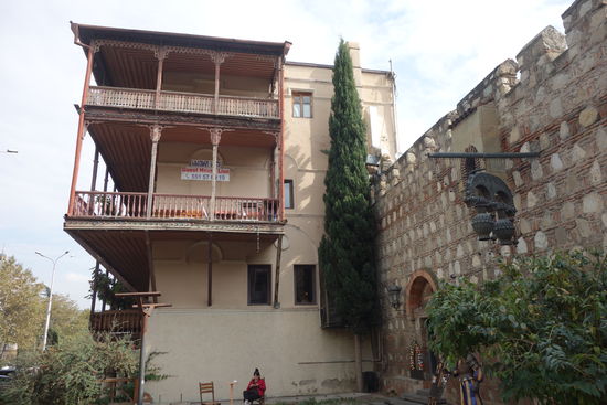 Anna hat damit ihre Aufgabe erledigt und wir sind wieder frei für eigene Besichtigungen. Da wir keine Mittagspause einlegen wollen, laufen wir den Baratshvili-Boulevard hoch, vorbei an repräsentativen Bauten und zahlreichen alten Holzhäusern auf der anderen Straßenseite, die in die alte Stadtmauer integriert sind.
