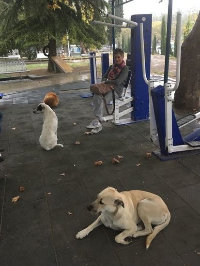 Wir schaffen es gerade noch zu einem überdachten Fitness-Übungsstand, an dem wir in geselliger Runde mit drei Hunden auf das Abklingen des großen Gewitterregens warten.