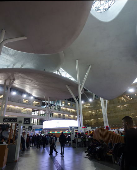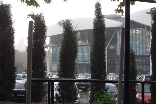 Nach diesem Exkurs in ein anders Stadtviertel möchte ich mir noch die moderne Architektur des städtischen Service-Centers - genannt 'Pilzgebäude' - ansehen. Doch beim Überqueren der Brücke tun sich über dem Hotelbau rabenschwarze Wolken auf.