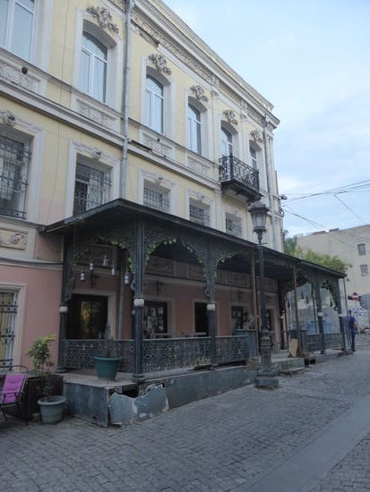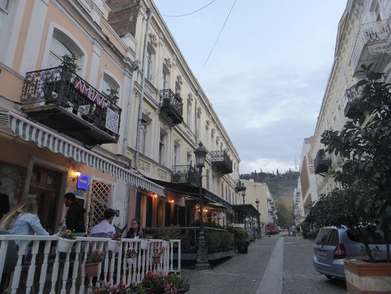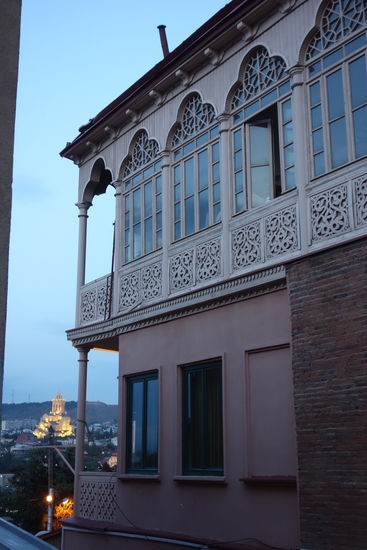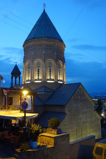 Da wir schon fast wieder am Steilhang unterhalb der Mutter Georgiens sind, beschließen wir noch einmal zum Bäderviertel zu gehen. Dort ist es allerdings nicht sonderlich bei Dunkelheit. Der Versuch auf eine der Dachterrassen zu gelangen, gelingt uns zwar, aber dort ist es derart ungemütlich, dass wir doch wieder in die ‚Fressgasse‘ gehen.