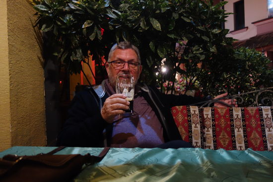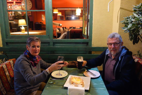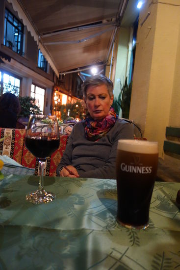 Ulrike hatte schon vorher ein Lokal ausfindig gemacht, in dem es Guinness gibt. Sie hätte nach ihrer Aussage sogar auf das Abendessen verzichtet, damit ich zu meinem Guinness komme. Aber in der Fressgasse gibt es es auch (und außerdem Leffe) – wir bleiben hier und bestellen ein Glas Rotwein ( hier kostet es da Zweieinhalbfache - dafür ist er aber auch mehr als doppelt so gut) sowie ein Pint of Guinness. Dazu ein nicht weiter zu behaltendes Gericht (Kara…..) – ein Teigtasche offen mit Käse gefüllt und einem Spieglei. Im Lokal gegenüber raucht man Schischa – als wir aufbrechen , nehme ich mir vor am letzten Abend, wenn es die Zeit erlaubt, dort eine zu rauchen.