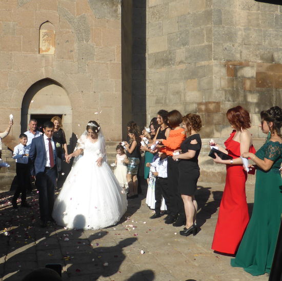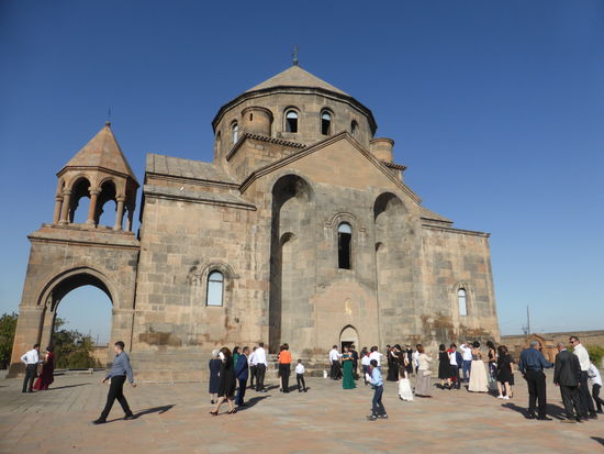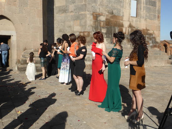 Die Hripsime-Kirche ist heute eine Heiratskirche, in der hintereinander geheiratet wird. Entsprechend viel Menschen sind anwesend. Alle toll rausgeputzt und die Damen in tollen Kleidern und mit Highheels, mit denen sie kräftig im Boden stochern.