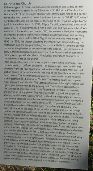 Die armenisch-apostolische Sankt-Hripsime-Kirche wurde von Katholikos Komitas über dem von Isaak dem Großen gebauten Mausoleum der heiligen Hripsime errichtet 618 vollendet. damit ist die Kirche eine der ältesten erhaltenen des Landes.