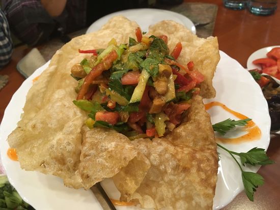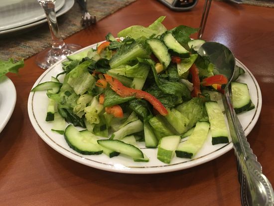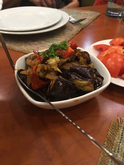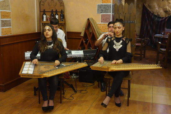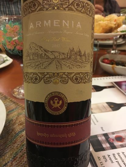 Inzwischen ist es schon früher Abend und wir fahren zurück in die Stadt, wo wir in einem armenischen Restaurant zu Abend essen. Vier verschiedene Vorspeisen und gekochtes Rindfleisch als Hauptgang, sowie Obst und Gemüse. Interessieren tut uns natürlich der armenische Wein. Wir ordern ein Flasche (4000 Dram = 8€). und sind angetan. Die anderen nehmen je ein Glas und bestellen im Laufe des Essens ein zweites. Der Herr gegenüber probiert hingegen schon den armenischen Cognac und macht ein zufriedenes Gesicht. Ulrike darf mal probieren und meint, den würde sie auch mal bestellen.