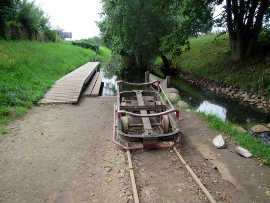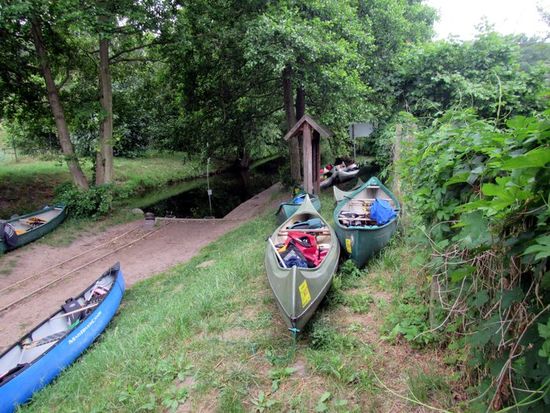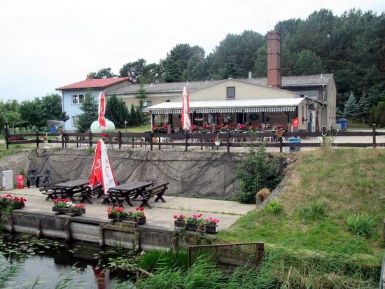 Nächster Stop ist an der Fischerei Babke, wo ein Wehr zu umtragen ist und ein Imbiss einlädt, es ist aber noch zu zeitig für "Mittag".