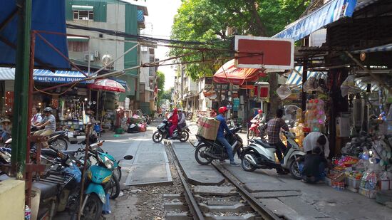 Kein Witz, in Hanoi gibt es die unglaublichsten Dinge zu sehen. Ge- bratene Hunde in den Schaufenstern von Metzgereien, oder Friseure, die ihren Kunden auf offener Straße mitten auf dem Gehweg die Ha- are schneiden. Ganz zu Schweigen von der Bahnlienie, die vom Bahn- hof durch enge Gassen zwischen den Häusern durch führt.