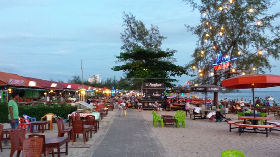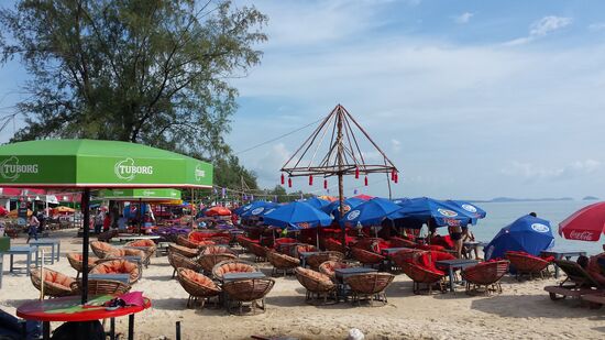 Noch ist das touristische Zentrum von Sihanoukville einfach. Entlang des Strandes ziehen sich Hütten in denen Lokale untergebracht sind. Das Essen ist günstig und saulecker. Man sitzt am Strand in gemüt- lichen Korbsesseln und kann die Füße in den Sand stecken.