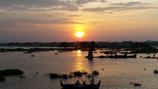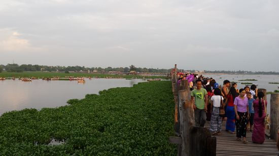 Zwischen Mandalay Hill und U Bein Brücke bleiben zwei bis drei ent- spannende Stunden am Hotelpool. Dann geht es mit dem Taxi zu der weit im Süden der Stadt gelegenen U Bein Brücke, der längsten und ältesten Teakholzbrücke der Welt. Sie zieht sich auf 1,2 km Länge über den Taung Tha Man See. An der U Bein Brücke herrscht ein un- glaublicher Auflauf. Ist das hier immer so, oder liegt das daran, dass in Myanmar zur Zeit Ferien sind, was mit dem bevorstehend Voll- mond von Thadingyut, dem Ende der Buddhistischen Fastenzeit zusammen hängt? Wahrscheinlich letzteres.