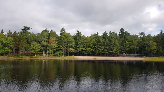 Die Fahrt zum Kejimkujik Nationalpark dauert etwa eine Stunde. Die meisten Einheimischen tun sich auch nicht leicht mit der Aussprache der Ortsnamen, die von den hier ansässigen indigenen Bewohnern ("First Nation") geprägt wurden. Es ist noch recht frisch, nur um die 10°. Im Visitor Center bezahle ich den Eintritt und bekomme die Auskunft, dass "Jakes Landing" der beste Startpunkt für Paddelausflüge ist. Dort ist früh noch wenig Betrieb. Nach einem kurzen Stück auf dem Mersey River gelangt man auf den großen Kejimkujik Lake. Auf dem See paddle ich nach rechts in Richtung Jeremys Bay. An schönen Badestellen in kleinen Buchten mache ich mehrere Pausen.