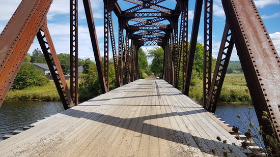 Über die Berge geht es weiter in das Annapolis Valley, genauer gesagt nach Bridgetown. Hier gibt es einen schönen Stadtrundgang, der mit einem blauen Band auf dem Fußweg markiert ist. Eine alte Eisenbahnbrücke führt über den Annapolis River (ohne Geländer!).