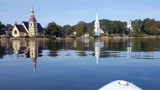 Nach dem sehr guten Frühstück geht es gegen 9:00 zu einer SUP-Tour in Richtung des Ortes Mahone Bay. Das Meer ist um diese Zeit noch sehr ruhig. Nach einer reichlichen Stunde erreiche ich den Ort mit der Postkartenansicht der drei Kirchen.