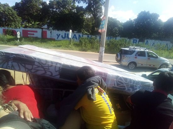 Auf die Ladefläche kommen noch drei weitere Personen und jede Menge Gepäck drauf. Ausserdem will jemand eine Matratze transportieren, die gerade vor den Señoras und über dem vielen Gepäck festgeschnürt wird. Damit ist für uns aus mit einer Sicht auf die Straße, die Matratze versperrt alles.