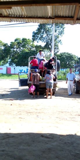 Doch es dauert noch eine Weile, bis es losgeht, wir setzen uns daher zunächst draussen in den Schatten. Da kommt eine Señora mit ihrem Kind und mit 5 oder 6 Taschen und vollgestopften Tüten. Als sie ihr Gepäck auf der Ladefläche verstauen, und sie ein Platz für sich und das Kind sucht, passt ihr irgendwas nicht. Sie diskutiert heftig mit den Männern und entscheidet sich doch nicht mitzukommen. Sie will auf die nächste Fahrgelegenheit warten und holt all ihre Tüten von der Ladefläche. Wir entscheiden uns daraufhin, besser schon Mal unsere Plätze zu sichern und steigen rauf auf die Ladefläche. Wir stehen hinter dem Brett, dass sie wischen das Geländer geschoben haben, damit zwei Señoras und ein Kind sitzen können. Denn vorne in der Kabine ist schon alles voll, ich will gar nicht wissen, wie viele Personen sich dort quetschen.