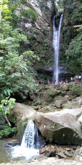 Unterwegs gibt es einen Essensstand und kurz vor dem Wasserfall Umkleidekabinen und Toiletten. Am Wasserfall sind einige Besucher, die entweder im Wasser planschen, rumalbern oder Fotos schießen.