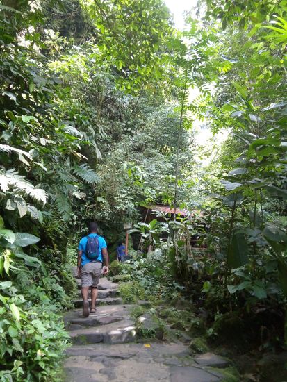 Um zu dem Wasserfall zu gelangen, bezahlen wir je 6 Soles Eintritt. Kurze Zeit später wird uns klar, dass wir hier noch ein Stück rauf gehen müssen. Also schnell noch Mal mit Mückenabwehr einschmieren, denn der Weg geht hoch durch den Regenwald.