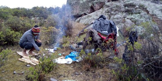Während ich voller Freude Fotos schieße, versucht Carlos vergebens ein Feuer zu machen und gibt irgendwann auf. Wir sammeln alles ein, steigen in unsere nassen Stiefel, und gehen den gleichen Weg von den Steinen runter, wie wir hochgekommen wird. All die Wege,die noch am Vorabend voller Wasser waren, sind zwar feucht, aber ohne Wasser und Pfützen. Und da erkennt Carlos auf einmal den Zeltplatz, den wir gestern wegen des vielen Wassers nicht gefunden haben!