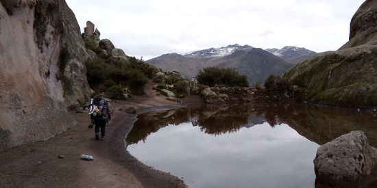 Irgendwann erreichen wir den Eingang oben und schauen uns um, suchen den Platz, auf dem man zeltet. Obwohl Carlos schon Mal hier war, sieht für ihn alles fremd aus. "Nein, hier ist es noch nicht", sagt er mir, "wir müssen noch etwas weiter". Und so schleppen wir uns weiter hoch, vorbei an dem vielen Wasser, was sich überall den Weg nach unten sucht. An einer Stelle passieren wir eine gigantische Pfütze, die schon fast einem kleinen See ähnelt. Wir klettern einen schmalen Steinweg hoch, der dabei ist, sich in einen Flusskorridor zu verwandeln, so viel Wasser kommt von allen Seiten runter. Oben angekommen, befinden wir uns auf gigantischen Felsformationen, weit und breit keine Erde. Also suchen wir auf der anderen Seite einen Abstieg und finden eine Stelle, die leicht runter geht. Wir gehen an kleinen Sträuchern vorbei, stets die Rinnsälen des Regenwassers ausweichend, doch der Hang scheint kein Ende zu nehmen. Wir haben keine Ahnung, wo wir sind und die Zeit drängt. Noch ist es 'hell', doch innerhalb der nächsten halben Stunde wir die Dunkelheit über uns einbrechen, dann werden wir keine Chance haben, irgendwo hin zu gehen. Mit leichter Panik entscheiden wir uns kurzerhand, an Ort und Stelle zu bleiben und das Zelt aufzubauen, an einer Stelle mit leichtem Hang. So hoffe ich, dass das Wasser immer irgendwie abfließen und und nicht überfluten wird.