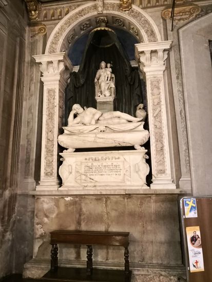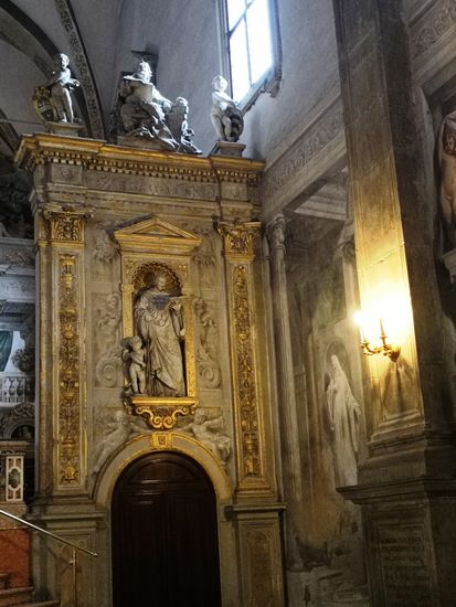 Der Seiteneingang der Kirche, der in einem Bogengang aus dem 16. Jh. geschaffen wurde, hat ein Felsensteinornat, von Andrea Formigine (1525) aus Stein gehauen wurde.