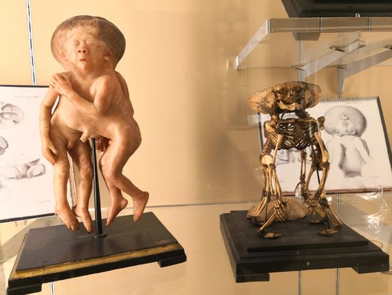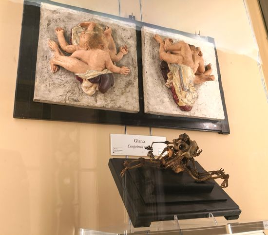 Erstaunlich und nicht für schwache Nerven, enthält es zahlreiche zart gestellte fötale Skelette und Modelle von Babys, die ohne verschiedene Organe geboren wurden. Bemerkenswert sind auch die verdrehten Rahmen der pathologischen fetalen Skelette und das merkwürdige Wachsmodell eines Albinos mit Hammelkoteletts und Meeräschen.