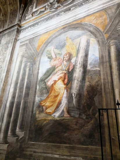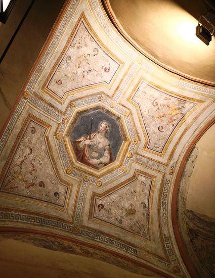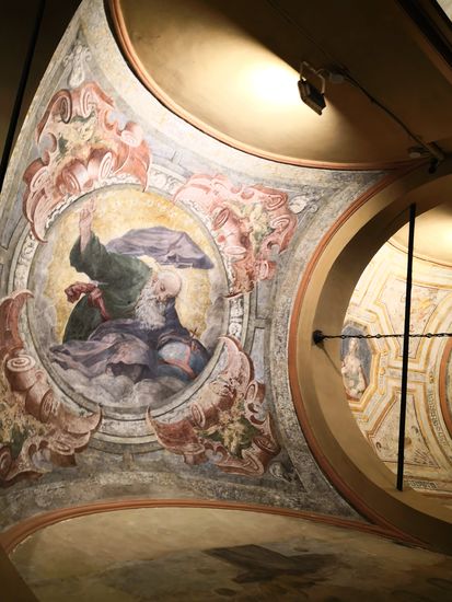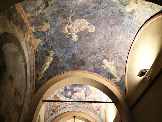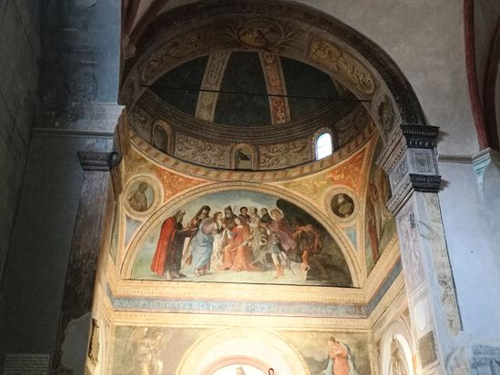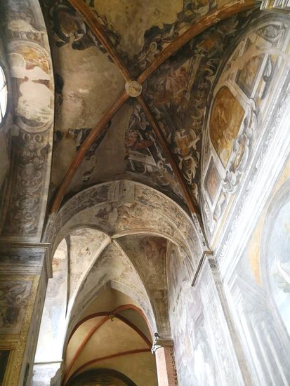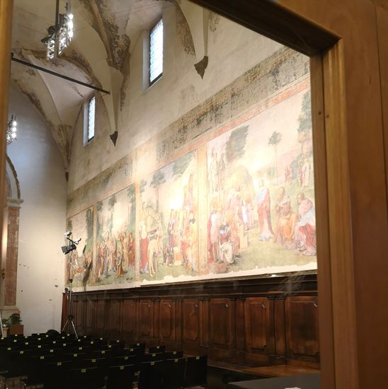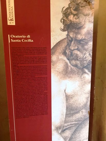 Im Klosterkreuzgang findet man das Oratorio di Santa Cecilia. Es weist Fresken der Renaissance-Maler Francesco Francia, Lorenzo Costa und Amico Aspertini auf. Wir können hineinschauen und einige Bilder machen.