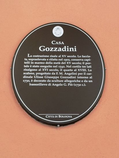 Casa Gozzadini -Der Bau stammt aus dem fünfzehnten Jahrhundert. Die Fassade, die 1902 erhöht und umgebaut wurde, bewahrt Marmorkapitelle aus der Mitte des 15. Jahrhunderts. Das Portal wurde 1542 ausgeführt. Im Innenhof stammen drei Seiten aus dem 16. Jahrhundert, die vierte bis 18. Jahrhundert. Die Treppe, die von FM Angelini für Kardinal Ulysses Giuseppe Gozzadini um 1730 entworfen wurde, ist mit allegorischen Skulpturen und einem Relief von Angelo G. Piò (1730) geschmückt.